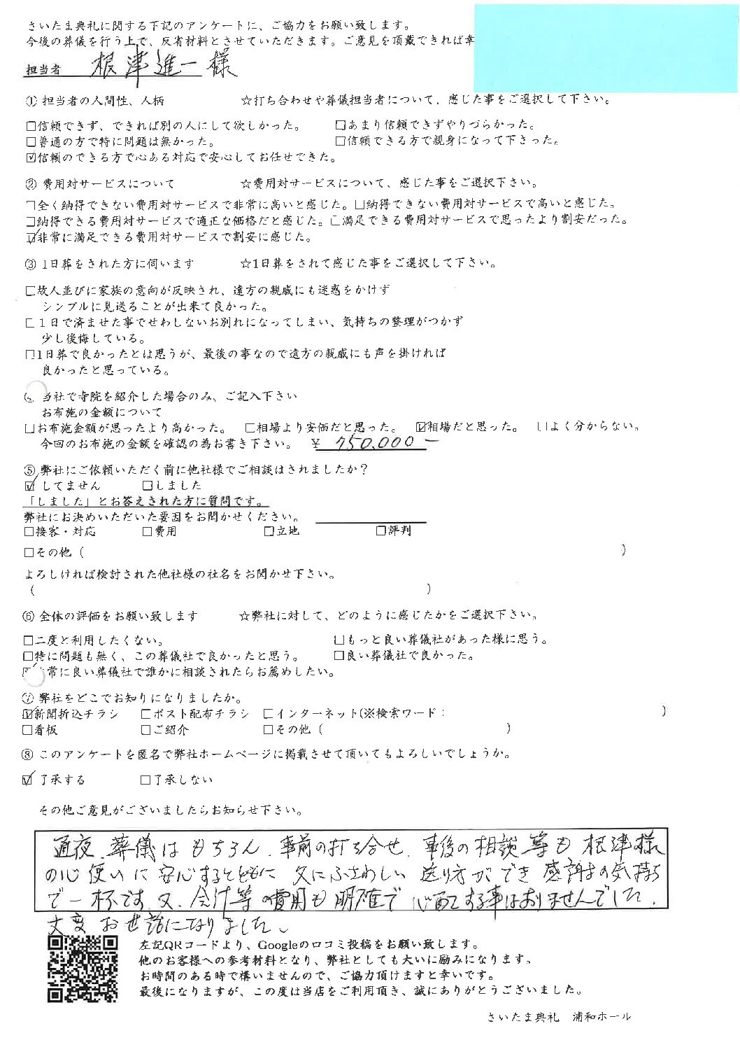 通夜、葬儀はもちろん、事前打ち合わせ、事後の相談等も根津様の心使いに安心するとともに、父にふさわしい送り方ができ感謝の気持ちでいっぱいです。 又、会計等の費用も明確で心配することはありませんでした。大変お世話になりました。