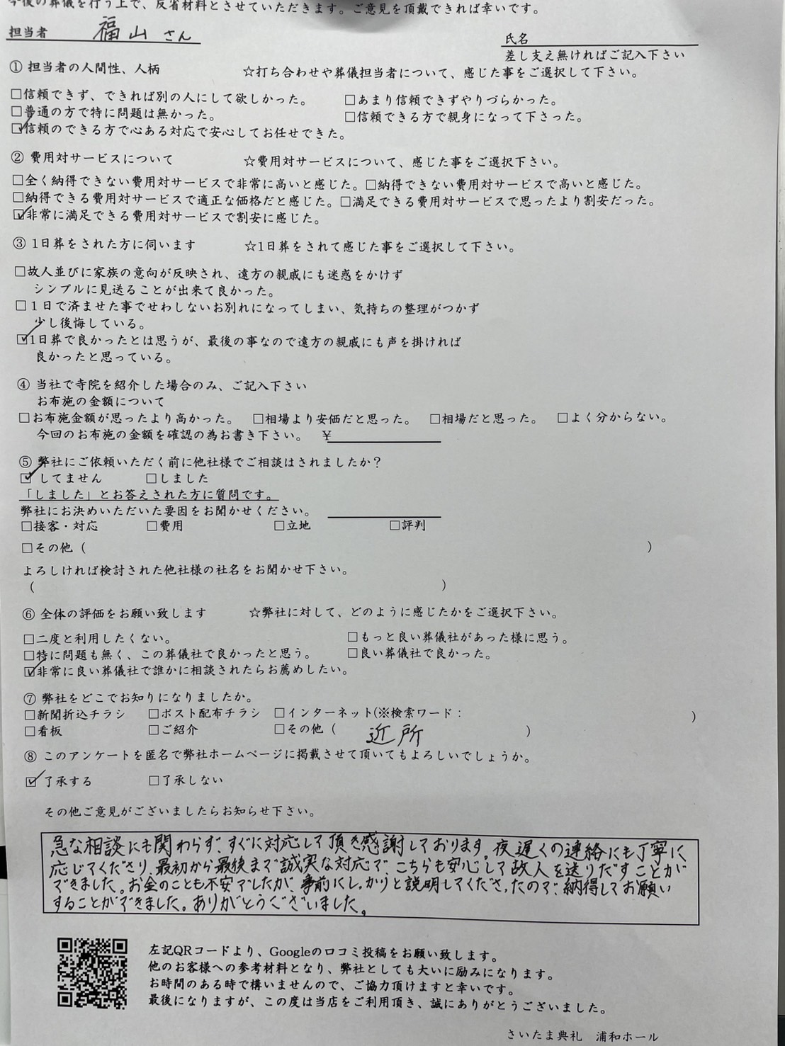 夜遅くの連絡にも丁寧に応じて下さり、最初から最後まで誠実な対応で、こちらも安心して故人を送り出すことができました。